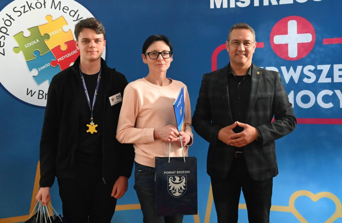 Uczestnicy zawodów musieli najpierw zmierzyć się z trudnym testem teoretycznym, a następnie udzielić fachowej pomocy w bardzo realistycznie symulowanych rozmaitych sytuacjach, wymagających konkretnych działań ratowniczych. Tym razem niewiele zabrakło do podium. Natomiast drugi rok z rzędu nasza drużyna zdobyła tytuł Mistrzów Powiatu Brzeskiego i odebrała dyplomy oraz cenne nagrody z rąk Pana Starosty, Jacka Monkiewicza.