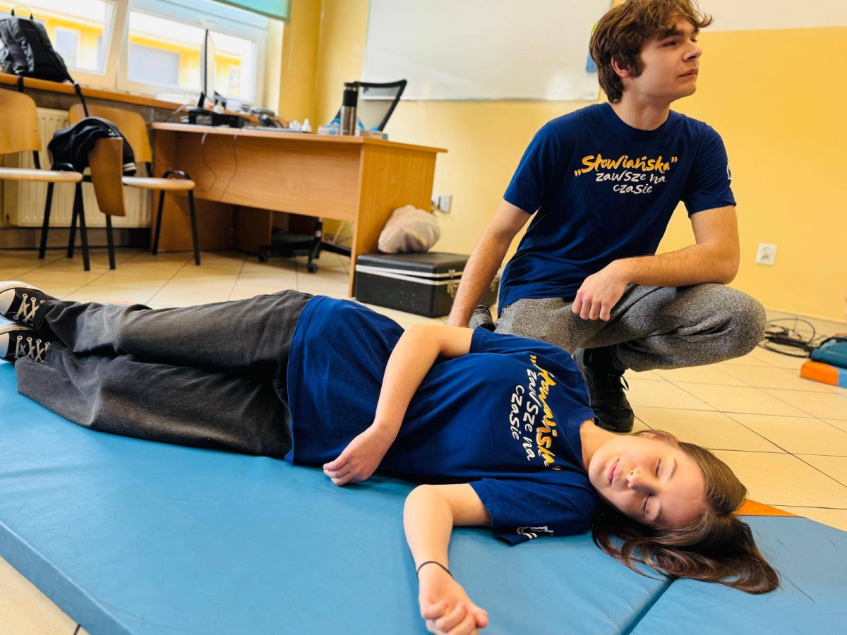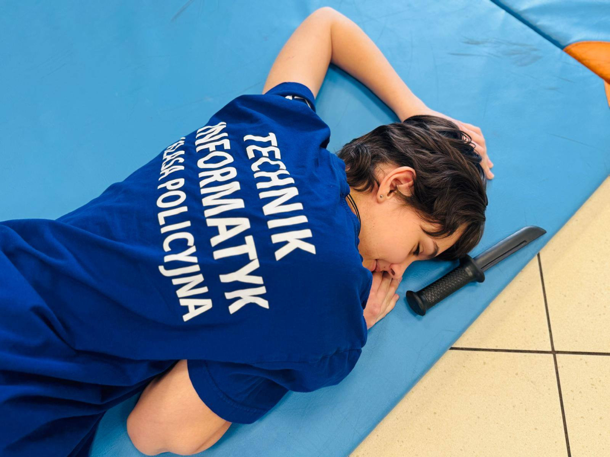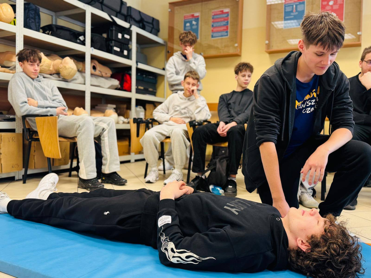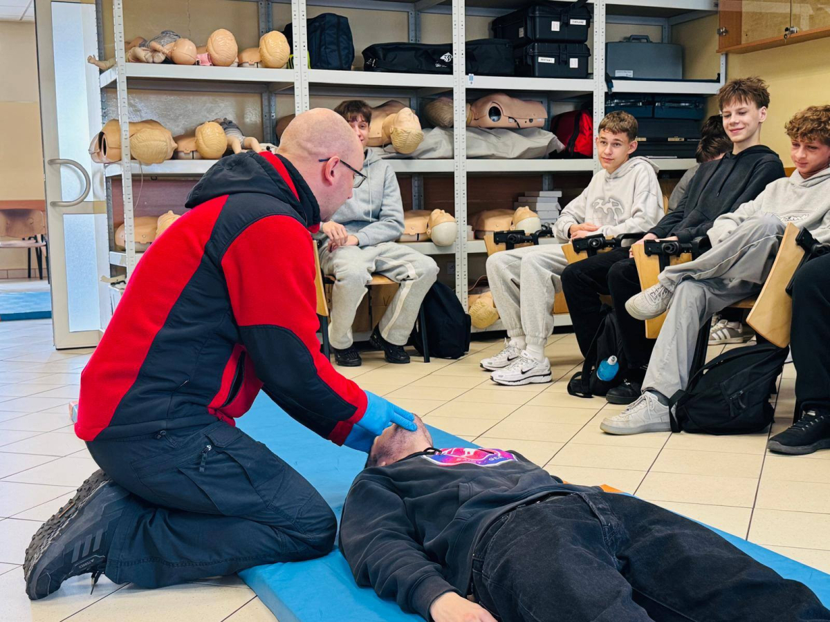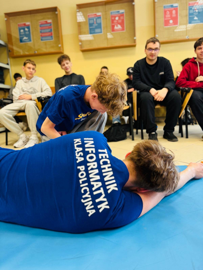 Pierwszy blok dotyczył udzielania pierwszej pomocy i został poprowadzony przez podinsp. Bartosza Saczka. Uczniowie przećwiczyli podstawowe czynności ratujące życie, stanowiące fundament pracy każdego funkcjonariusza.
