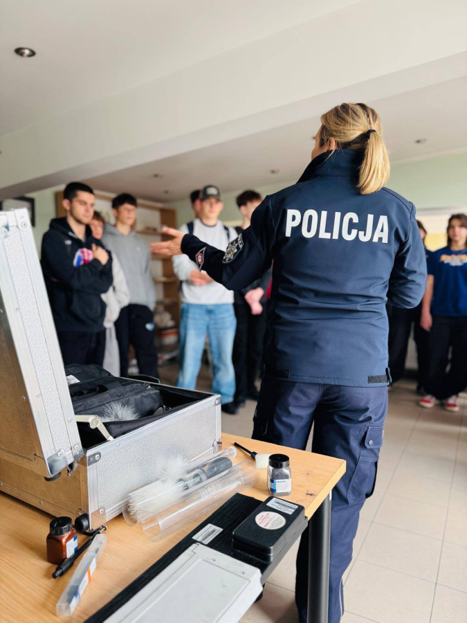 Dużym zainteresowaniem cieszyły się także warsztaty z zakresu kryminalistyki, które poprowadziła podkom. Natalia Karpuk. Podczas zajęć młodzież poznała tajniki zabezpieczania śladów na miejscu zdarzenia oraz specyfikę pracy technika kryminalistyki.